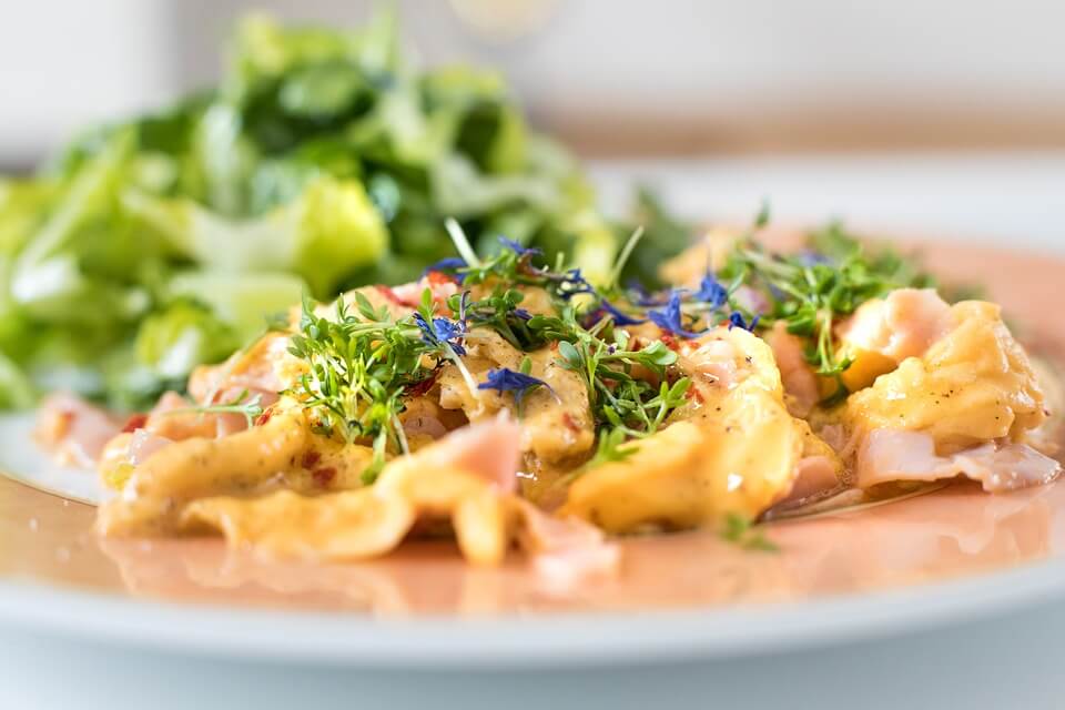 - 2 яйца, овощной салат с заправкой из лимонного сока или ложки легкой сметаны, а также чай или кофе с молоком без сахара;