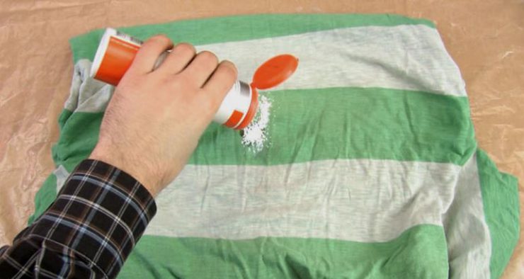 - Нанесите тальк или измельченный мел на загрязненный участок и оставьте на 2–3 часа. Затем уберите порошок и постирайте вещь в теплой воде.