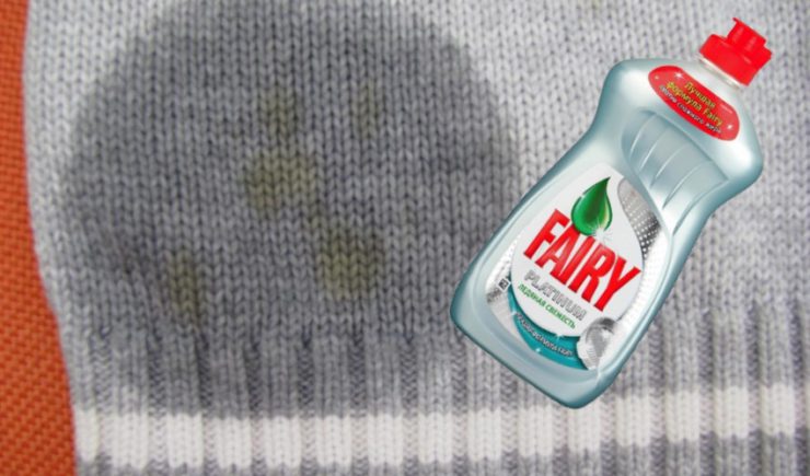 После обработки тальком или крахмалом, аккуратно стряхните порошок и нанесите на пятно жидкое средство для мытья посуды, которое эффективно справляется с жировыми загрязнениями. Оставьте средство на 10-15 минут, затем тщательно промойте холодной водой.