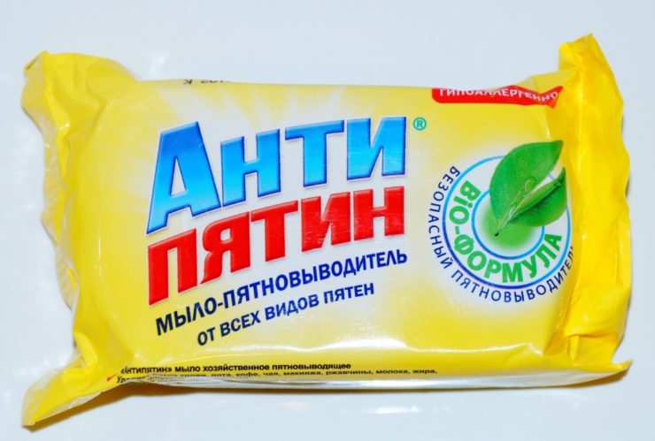 | Мыло «Антипятин» | Намылить смоченное водой испачканное место. Через 15–20 минут постирать вещь. | Отсутствуют. |