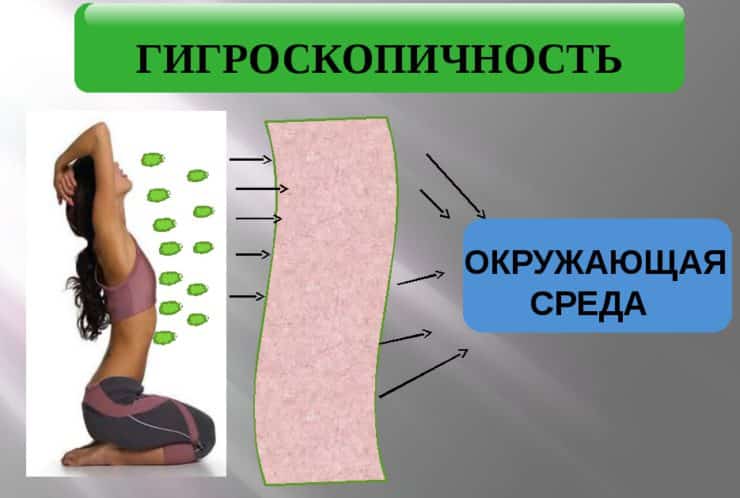 Данный термин обозначает способность материала изменять свои исходные характеристики под влиянием влаги, поглощая и удерживая ее в своих волокнах. Проще говоря, гигроскопичность — это способность предмета впитывать жидкость. При этом речь идет не только о воде, но и о различных осадках, таких как снег или дождь, а также о естественных выделениях человеческого организма, например, поте.