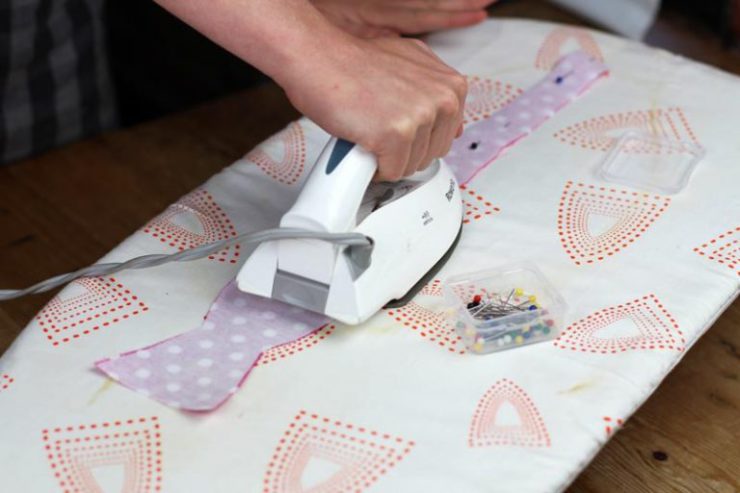 - Утюг разогревают до необходимой температуры. Утюгом аккуратно проводят по поверхности клеевого материала, задерживаясь на одном месте на несколько секунд. Сколько времени держать утюг на ткани, зависит от марки прокладочного материала. Некоторые требуют увлажнения и добавления пара. Не стоит слишком долго держать материю под горячей поверхностью, это приведет к расплавлению подкладки. Не рекомендуется утюжить поверхность – из-за этого на ткани могут появиться пузыри и деформация.