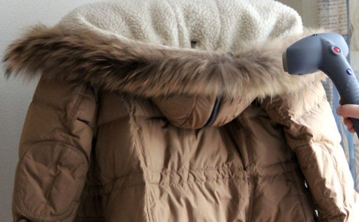 Парогенератор или утюг с опцией вертикального отпаривания помогут прогладить куртку бесконтактным способом, с расстояния 1-3 см. Обработка паром также поможет избавить вещь от пятен и устранить неприятные запахи. Это простая и щадящая для ткани процедура включает несколько этапов: