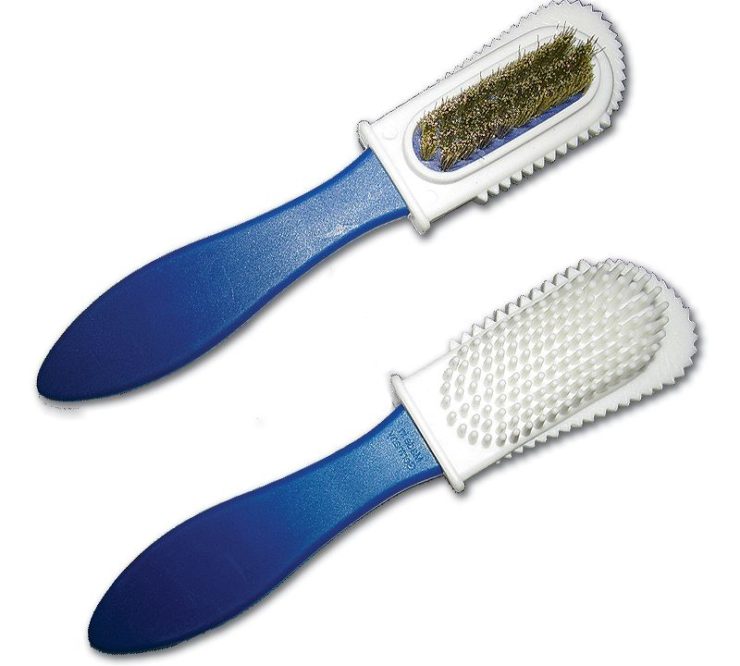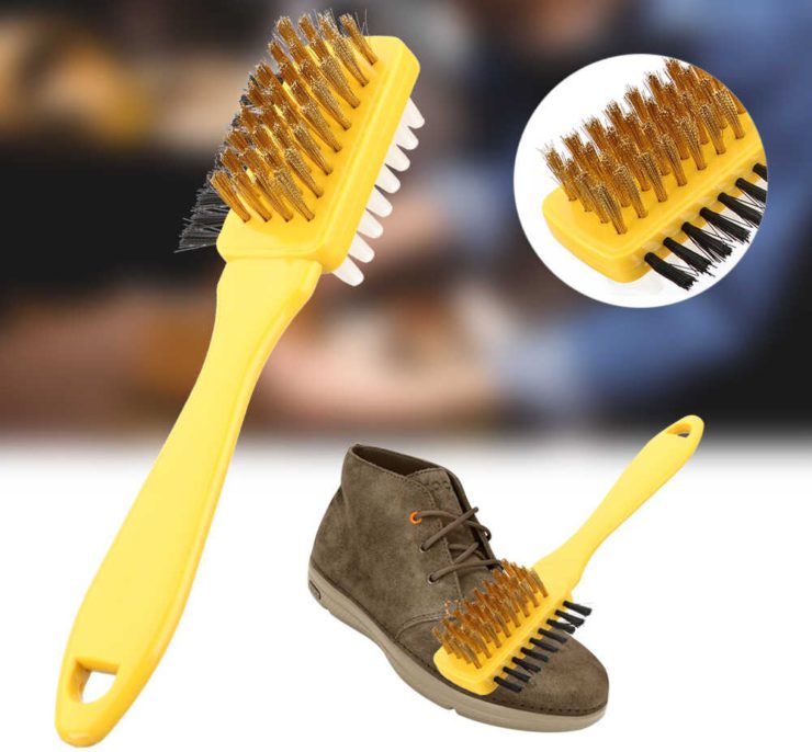 Двойные. Эти щетки имеют натуральную щетину с одной стороны и металлическую с другой. Обычно металлическая часть выполнена в виде узкой полосы посередине прямоугольника из натурального ворса. Она используется в зависимости от степени загрязнения и свойств материала изделия. Эта модель позволяет приподнимать верхние ворсинки замши или нубука, придавая поверхности бархатистый вид. Рекомендуется использовать ее после основного очищения и полного высыхания обуви.