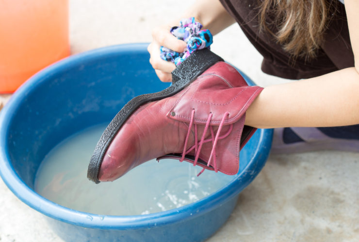 После любого выхода на улицу с обуви необходимо смыть пыль, грязь. Это особенно актуально для весенне-осеннего периода, когда на земле лужи, слякоть. Мыть туфли нужно аккуратно, чтобы у них не отклеилась подошва, с которой также нужно удалить грязь. Сделать это можно следующими способами: