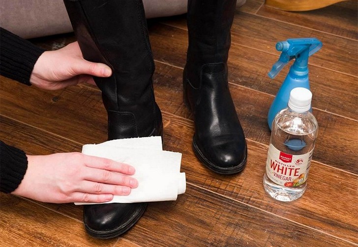 - Зимой на сапогах часто образуются солевые разводы. Их легко удалить с помощью уксусной воды. Для этого нужно приготовить раствор: в одном стакане воды растворите одну столовую ложку уксуса. Смочите чистую ткань в этом растворе и аккуратно протрите поверхность обуви. Также можно воспользоваться специальными средствами для удаления таких следов, например, «Salton Антисоль» или «Tarrago Universal Cleaner».