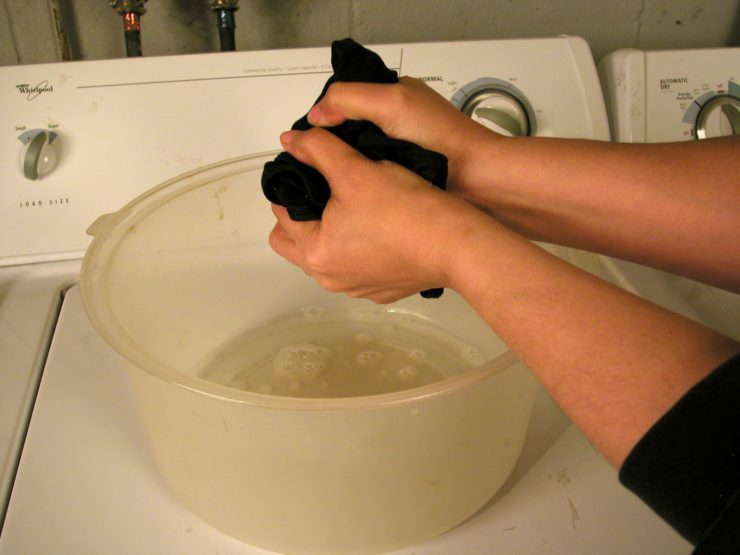 - Перед тем как поместить вещи в емкость с водой, нужно предварительно полностью растворить в ней подходящее моющее средство.