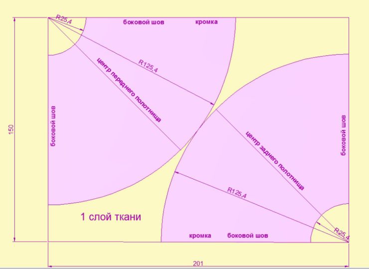 | Расход ткани (при ширине 150 см) | 2 * (R + ДИ) + 10-20 см на припуски и подгиб | (R + ДИ) + 10-20 см на припуски и подгиб |