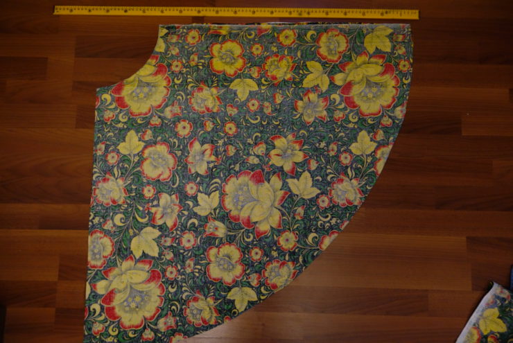 Из плотной бумаги с учетом вычисленных значений необходимо вырезать выкройку. Разместив на полотне лекало, вырезать его по контуру. Материю при раскрое рекомендуется сложить в 4 раза. Ткань лучше раскладывать на ровной горизонтальной поверхности изнаночной стороной вверх.
