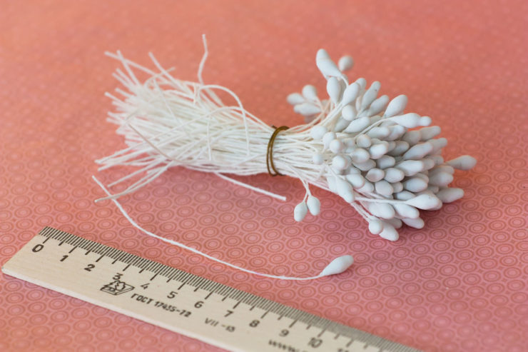 Тычинки и пестики изготавливаются из ваты, смазанной клеем ПВА, которую накручивают на проволочный литон (цветоножку или черешок), а затем обмакивают в манку, окрашенную в желтый цвет. Листья создаются из непрозрачных тканей, таких как атлас, шелк или бархат. Обычно каждый лист состоит из двух слоев материала, между которыми размещается проволока.