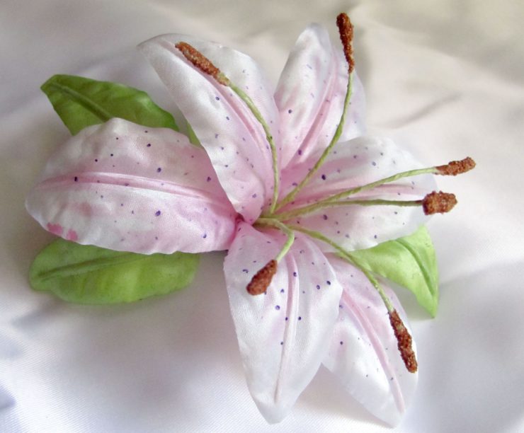 Что касается лилии, то ее лепестки обклеивают пестик. В каждый из лепестков предварительно вставляют тонкую проволоку, а собранный цветок обвивают проволокой и обклеивают гофрированной бумагой или тонкой тканью. Орхидею можно собирать как на проволоке, так и фиксируя лепестки клеем на прочной основе. При необходимости цветы окрашивают акриловыми или специальными батиковыми красками.