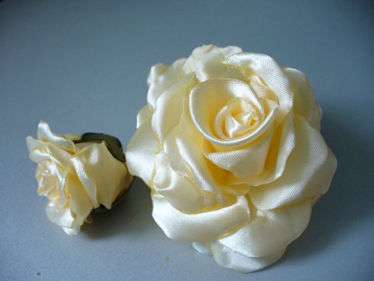 Атласная или подкладочная ткань имеет матовую и блестящую стороны, обыгрывая которые, можно создать имитацию живого растения. Из атласной ткани делают лепестки, а также листья. Для придания дополнительной жесткости их пропитывают или смазывают желатиновым составом или поливиниловым спиртом. Роза на фото сделана из белого атласного материала, обработанного желатином.
