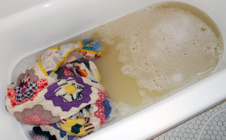 - Осторожно помять одеяло руками, избегая интенсивного трения. Некоторые хозяйки предпочитают встать ногами в ванну и аккуратно топтать мокрое изделие.