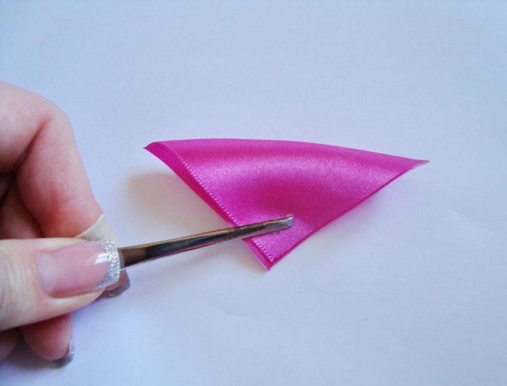 - Сложите материал несколько раз по диагонали, закрепляя его нитью или клеем, чтобы в нижней части образовался свободный край, который станет сердцевиной розы.