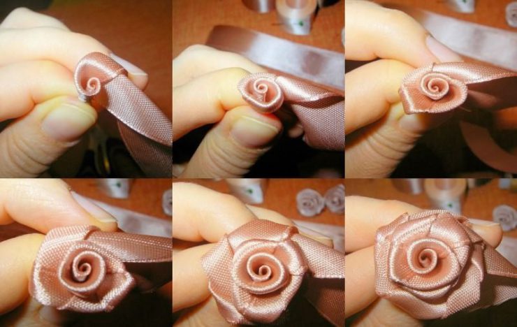 - Оборачивайте серединку лепестками, сгибая ленту, и фиксируйте их у основания с помощью нити или клея.