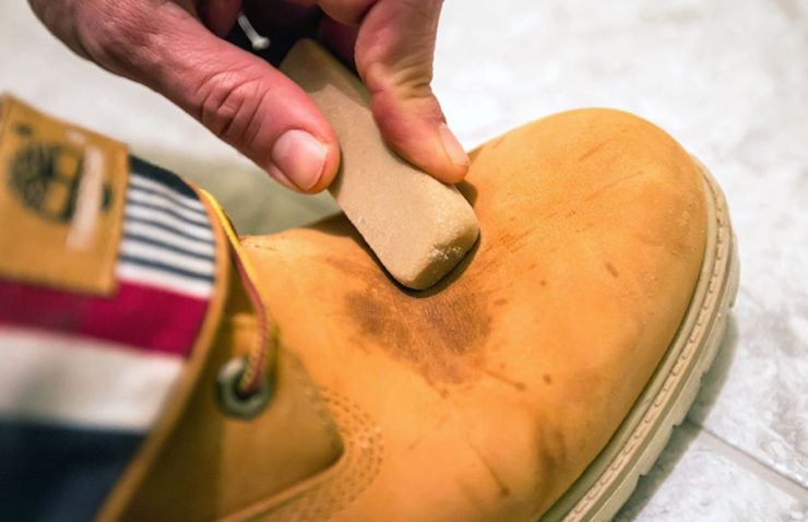 Ластик. Для ухода за обувью из ворсистой кожи подойдет ластик из резины или пенорезины. Обычно он двусторонний – с гладкой и шершавой поверхностями. Такой инструмент эффективно устраняет грязевые потеки, следы от соли и мелкие царапины.