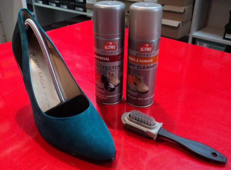 - После этого обувь следует просушить, а затем на чистую и сухую поверхность нанести пропитку для нубука и замши – это поможет удалить пятна и восстановить внешний вид, а также придаст водоотталкивающие свойства.