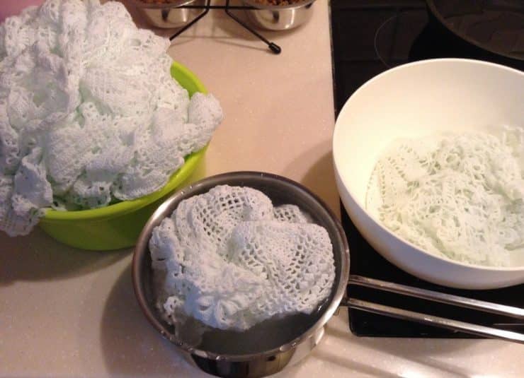 - Кружева. Для подкрахмаливания кружевных изделий больше всего подходит среднеконцентрированный клеевой раствор. Для придания кружевам ослепительной белизны клей и воду следует заменить рисовым крахмалом и молоком.