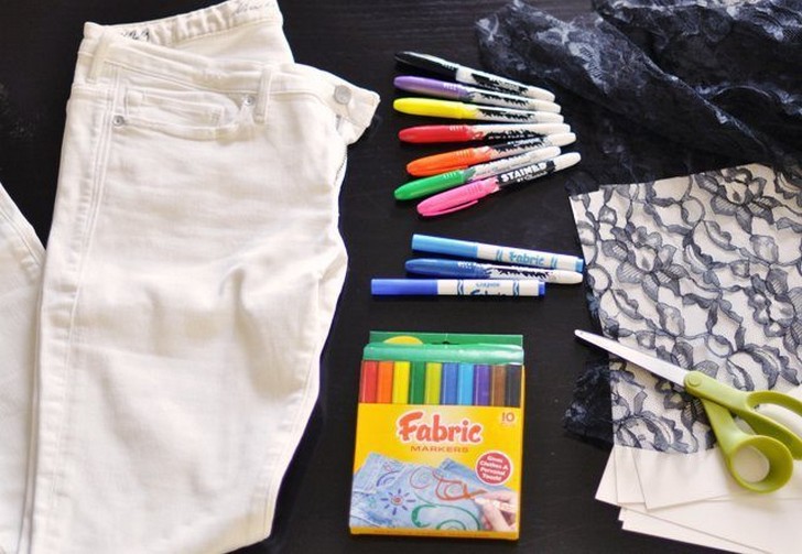 | Фломастерами | Разломить стержни 2–3 фломастеров нужного оттенка и поместить их в теплую воду. После того, как вода окрасится, средство готово к использованию. | Замочить изделие в окрашивающем растворе на 3–4 часа. После этого прополоскать брюки и высушить. |