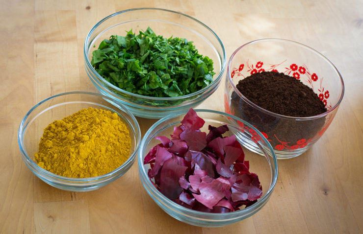 Для получения зеленого цвета используют сок шпината, отвар из листьев бузины и ягоды можжевельника. Оттенок индиго достигается при смешивании куркумы с соком свежего шпината. Эта золотистая приправа в сочетании с травяным отваром создает красивый и насыщенный тон.