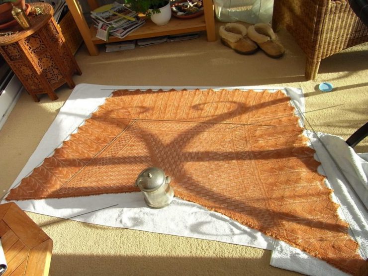 Пуховый платок лучше всего сушить на специальной рамке. Для этого нужно удалить с платка влагу, протянуть через зубчики на краях плотную нить и зафиксировать его на рамке, прикрепив нить к гвоздикам на рейках. Далее рамку нужно убрать в хорошо проветриваемое место, защищенное от солнечных лучей. Для восстановления воздушности и легкости изделия после удаления влаги нужно положить его в морозильник. Далее шаль встряхивается для избавления от кристалликов льда и досушивается на рамке.