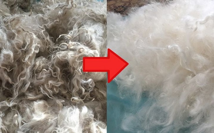 - В последнюю (чистую) воду добавьте кондиционер для волос. Выньте пух и дайте ему стечь, а затем разместите на решетке для сушки.