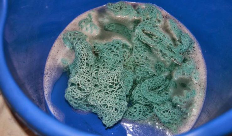 - Переместите мешочек в чистую теплую воду. Полощите, меняя воду, до тех пор, пока она не станет прозрачной.