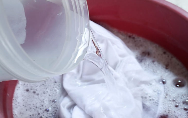 - Замочить изделие на 30–60 минут в теплой мыльной воде. Рекомендуется использовать жидкие моющие средства, так как они легче вымываются из волокон ткани по сравнению с порошками.