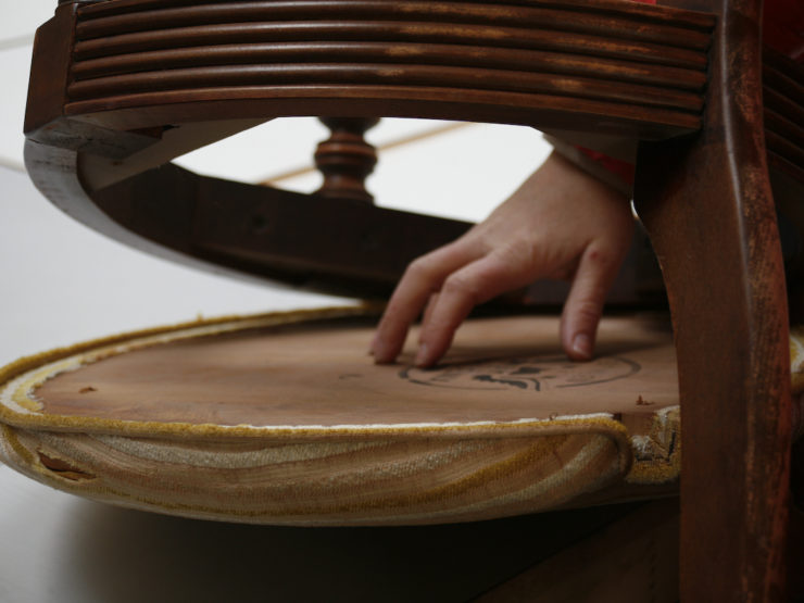 Далее с деталей мебели можно снимать старую обивку. Для этого подойдет антистеплер или плоская отвертка. Не стоит выбрасывать старую ткань – по ней без труда можно изготовить лекала для новой обивки. Далее необходимо удалить накопившуюся внутри пыль. От пришедшего в негодность набивочного материала тоже нужно избавиться.