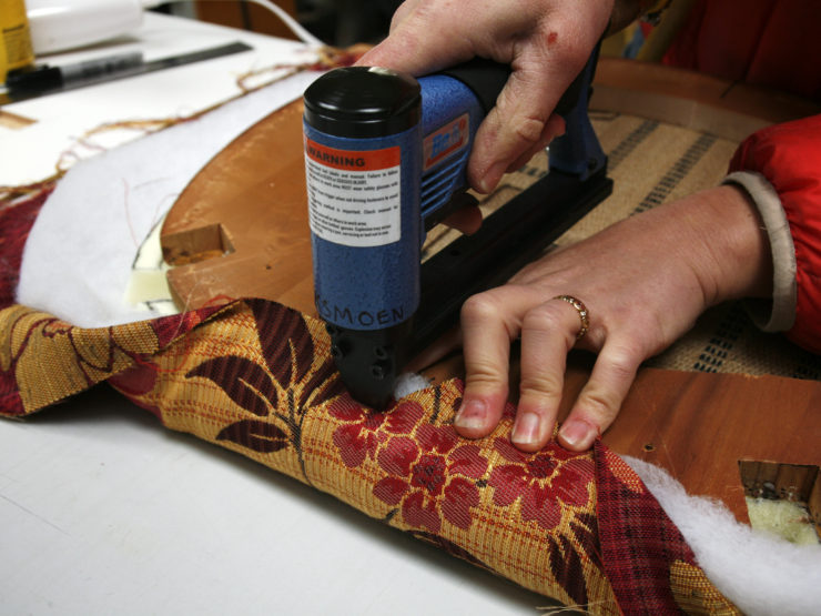 Для создания мебельной обивки не подойдут обычные нитки, так как они слишком тонкие и ненадежные. Вам понадобятся специальные армированные нитки. В местах, где материал подвергается наибольшему натяжению, следует использовать двойную строчку. Для шитья в домашних условиях можно воспользоваться старыми швейными машинами, так как современные бытовые модели не справятся с толстыми тканями.