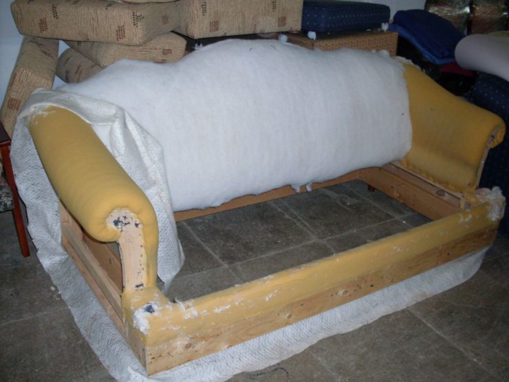 Специалисты комбинируют два вида поролона, в основание идет более жесткий, ближе к поверхности – мягкий. Закончив работы по реставрации внутреннего наполнения дивана, можно переходить к внешней обивке.