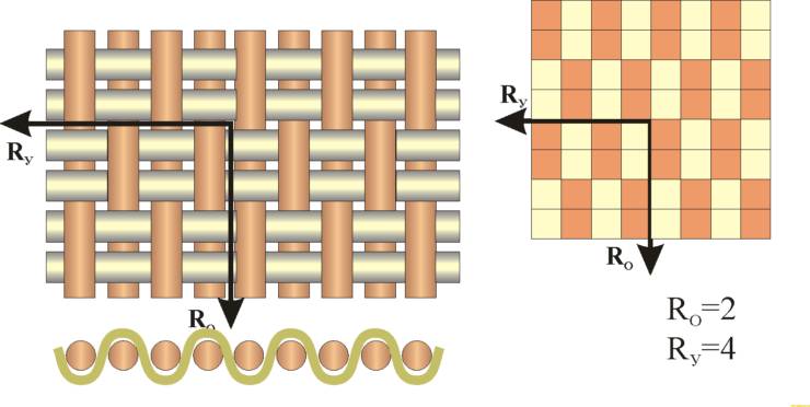 - Раппорт (R) – количество перекрытий, после которого начинается повторение чередования. В зависимости от нити, по которой ведется отсчет перекрытий, различают раппорт по основе (Ro) и по утку (Rу).