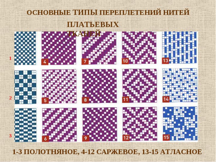 Классификация переплетений нитей в тканях со схемами