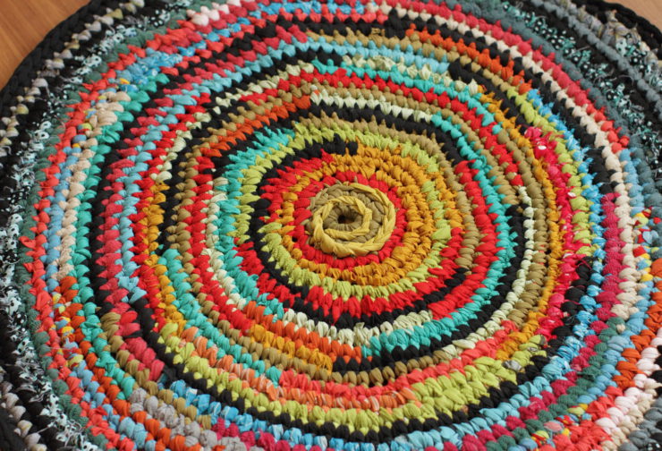 - Используя большой крючок (№10), свяжите коврик из трикотажной «пряжи». Начните с цепочки из 7 воздушных петель, замкните их в круг. Продолжайте обвязывать основание по кругу простыми столбиками и столбиками с накидом, пока не достигнете нужного диаметра.