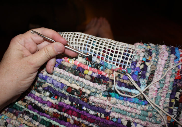 Каждую полоску следует закрепить в ячейках сетки. Это можно сделать с помощью крючка или вручную, завязав концы ткани узлом. Аналогичным образом можно прикреплять полоски из искусственного меха, что сделает изделие еще более пушистым и мягким. Плетение ковра не представляет сложности, с этой задачей справится даже ребенок. Главное – это терпение и аккуратность.