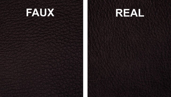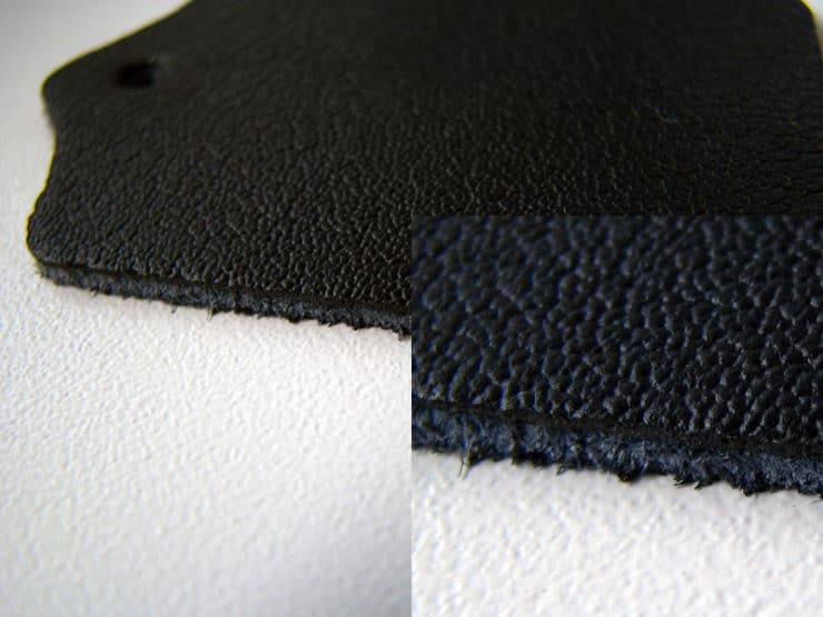 Структура и цвет натуральной кожи неоднородны. Поры имеют схожесть, но не идентичны. Рециклированный заменитель окрашен равномерно и выглядит идеально. Запаянные швы и ровные края характерны для изделий из рециклированной кожи. В то время как края изделий из натуральной кожи глубоко подогнуты и завернуты.