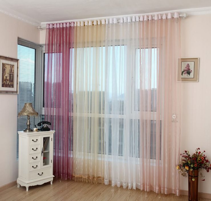 - Комбинирование двух полотен одного цвета, на одно из которых наносится узор или рисунок. Оригинальным решением является использование тончайших штор пастельных оттенков, на одной из которых контрастными нитями вышит орнамент.