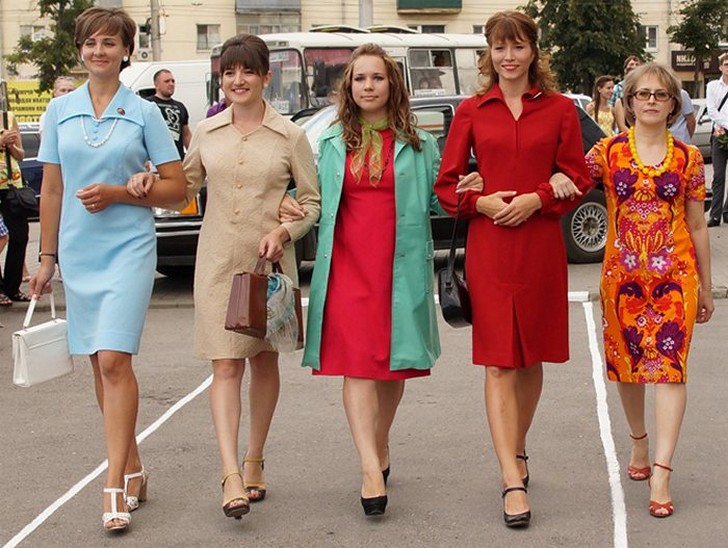 Еще один интересный вариант – приталенное ретро-платье длиной миди с рукавами три четверти и воротником-стойкой. Для завершения образа подойдут платок на голову, плащ из болоньевой ткани и крупные темные очки.