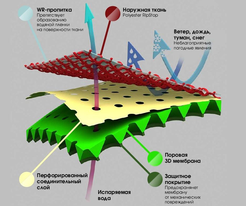 | Состав мембранной ткани | Мембранный слой: Полиуретан (PU), политетрафторэтилен (PTFE), полиэстер. Наружный слой (лицевая ткань): Нейлон, полиэстер. Внутренний слой (подкладка): Сетка, флис, трикотаж. |