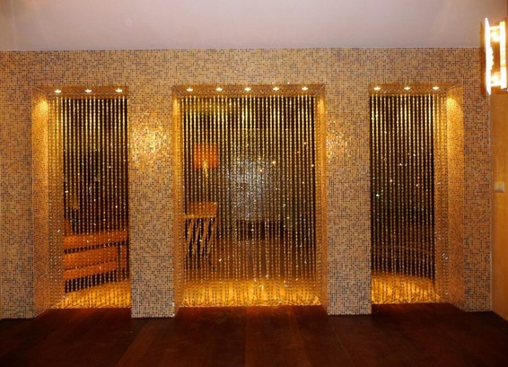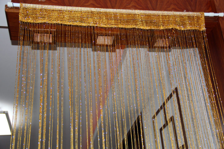 Для зала или гостиной подойдут занавески с бусинами или стеклярусом. В прихожей лучше повесить шторки из деревянных или металлических деталей.