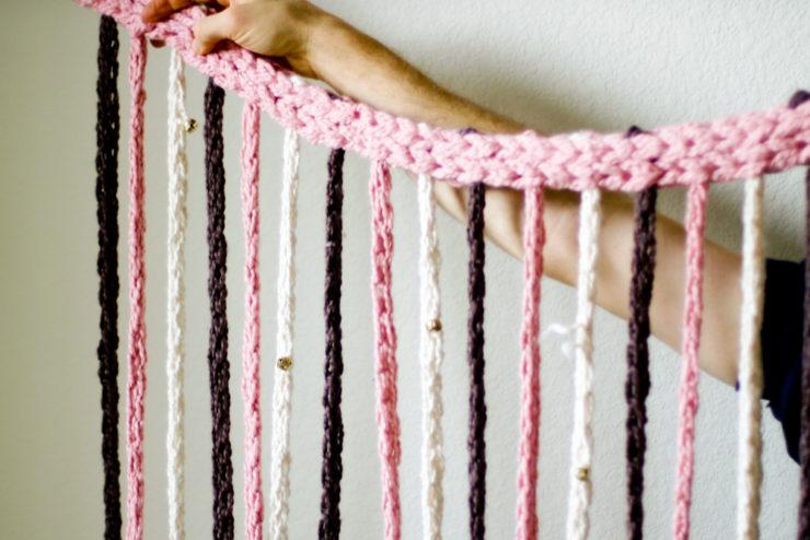 Нити нарезаются на равные отрезки и крепятся к основе. Их можно привязать или пришить к тесьме. Затем следует украсить шторы выбранными элементами. Концы нитей завязываются в узелки или обрабатываются огнем. Готовую штору можно повесить любым удобным способом.