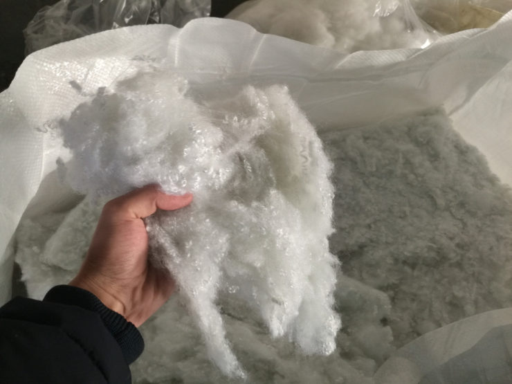 Второй тип синтепонового наполнителя изготавливается из переработанных пластиковых бутылок и одноразовой посуды. Хотя такой наполнитель стоит дешевле, его качество значительно ниже – он склонен к образованию катышков и деформации уже после нескольких стирок. Для того чтобы сделать вторичное сырье пригодным для использования, требуется тщательная обработка. Важно удалить загрязнения и этикетки, так как посторонние элементы мешают созданию однородного полотна. В состав вторичного сырья также добавляются кислотообразующие поглотители и стабилизаторы.