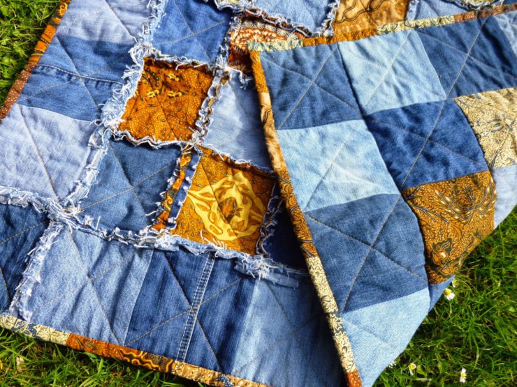 Джинсовая ткань, известная как деним, прекрасно подходит для создания изделий в технике пэчворк. Это прочное и плотное хлопковое полотно, получаемое благодаря саржевому переплетению, отличается высокой устойчивостью к износу. Из него можно изготавливать покрывала, коврики, подушки, сумки и множество других аксессуаров.