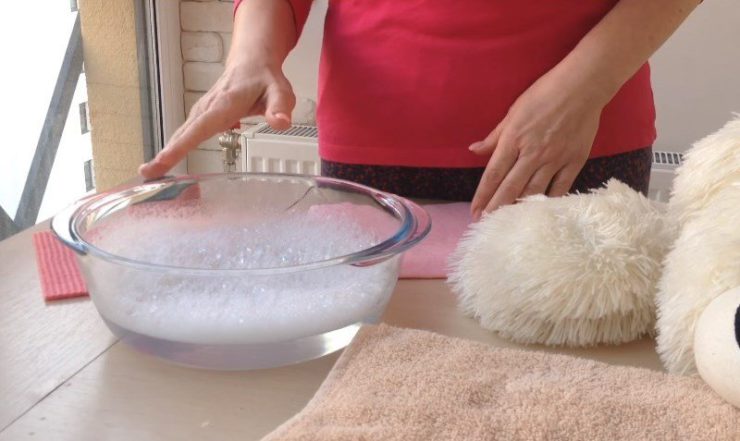 - Подготовка моющего раствора. Для этого необходимо развести жидкое средство для стирки шерстяных изделий в горячей воде. После этого следует дождаться, пока температура воды не опустится до 30 градусов.
