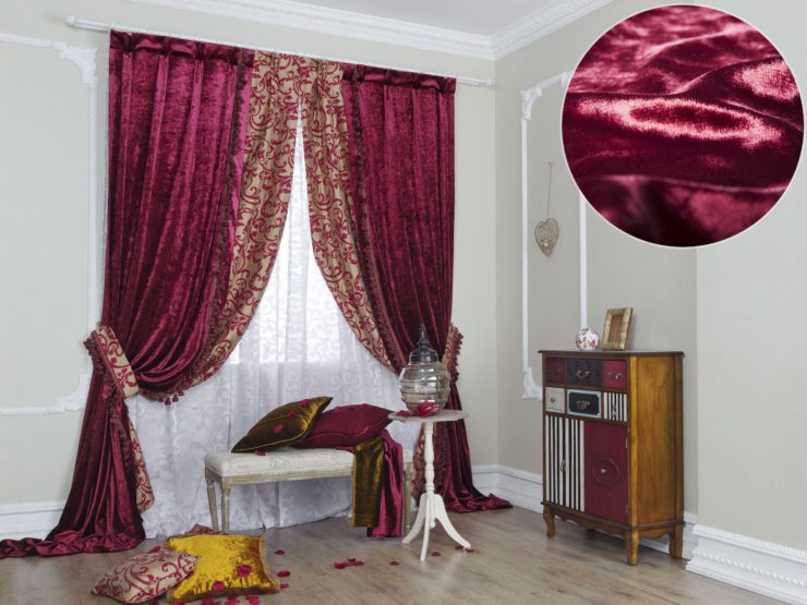 - Бархат. Это ткань с ворсом, основу которой составляют шелковые волокна. Бархатные портьеры хорошо смотрятся в больших по площади гостиных. Не стоит вешать их в маленьких комнатках, они визуально уменьшают площадь. Не рекомендуется размещать их в спальнях, потому что на бархате быстро скапливается пыль.