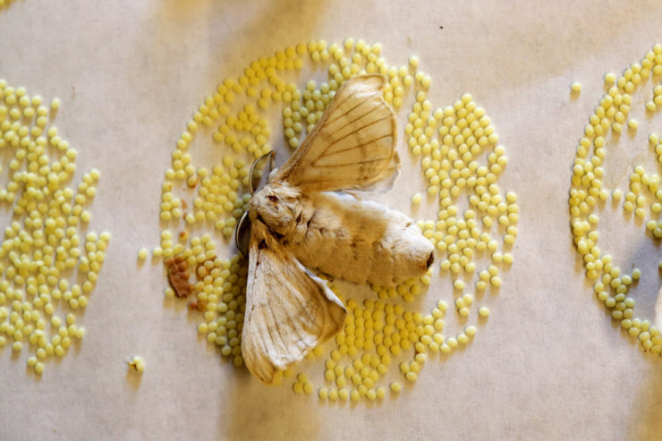 - После спаривания в течение нескольких дней самка шелкопряда (см. фото) откладывает от 4 до 7 сотен яиц. Затем крохотные яйца (каждое размером 1–1,5 мм) сортируют и подвергают ускоренной инкубации. Гусениц, которые появляются на свет через 10 дней, кормят листьями тутового дерева столько времени, сколько потребуется, чтобы насекомые достигли размера в 7–7,5 см.