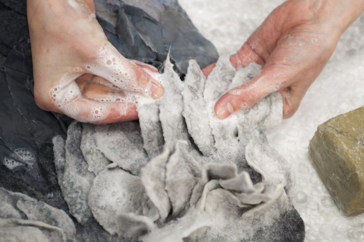 - Растворите мыло в теплой воде. Для работы с шерстью подойдет любое мыло или средство для мытья посуды. Смачивайте заготовку и накрывайте пленкой.