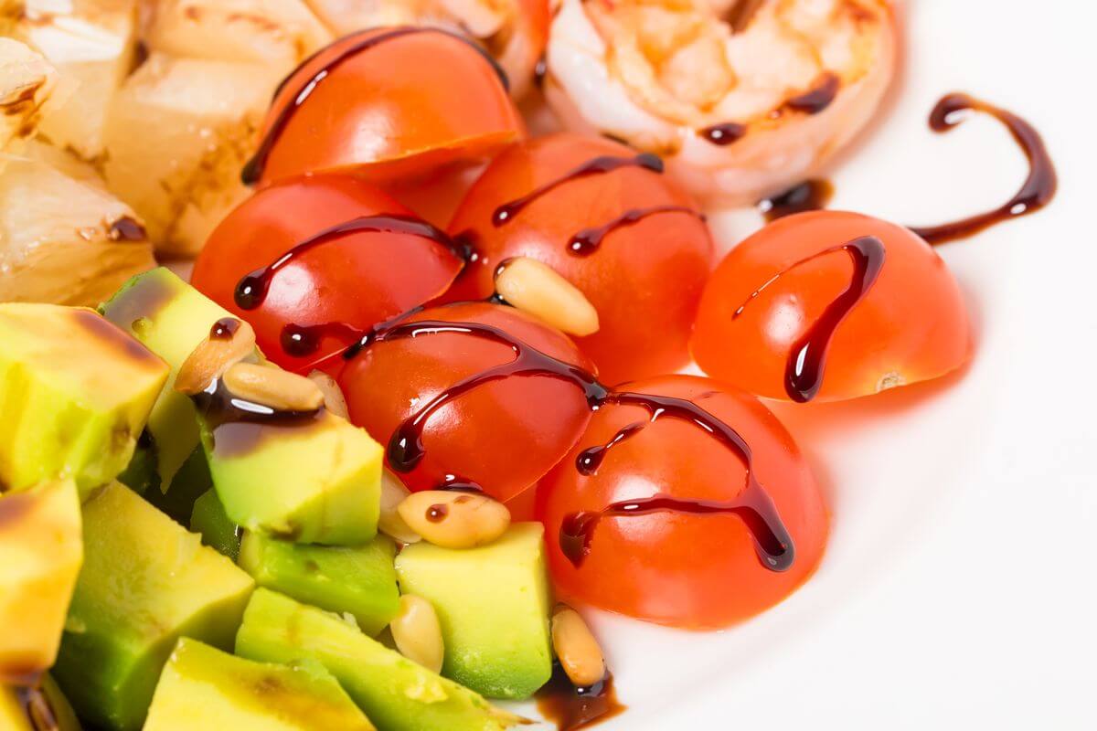 - Сложить все ингредиенты в миску, заправить бальзамическим уксусом. Подавать салат со свежей зеленью и половинками черри. Можно украсить кедровыми орешками.
