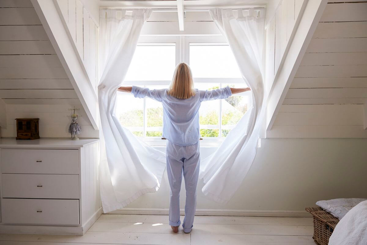 Чем больше его будет с утра, тем лучше. Летом проще — достаточно пошире раскрыть гардины. Хорошо, если окна выходят на восточную сторону и рассветное солнце в них заглядывает. В пасмурную погоду, зимой и осенью рекомендуется включать яркий верхний свет. Он поможет быстрее прийти в бодрое состояние.