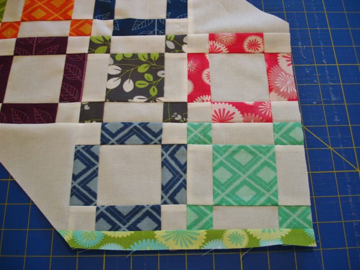 Для начала необходимо нарезать равные по размеру блоки из тканей различных оттенков. Эти кусочки сшиваются в одно полотно, которое затем сворачивается в рулон. Рулон также следует сшить, а после этого нарезать на равные полосы поперек швов. Каждая полоска должна содержать разные цветовые блоки.